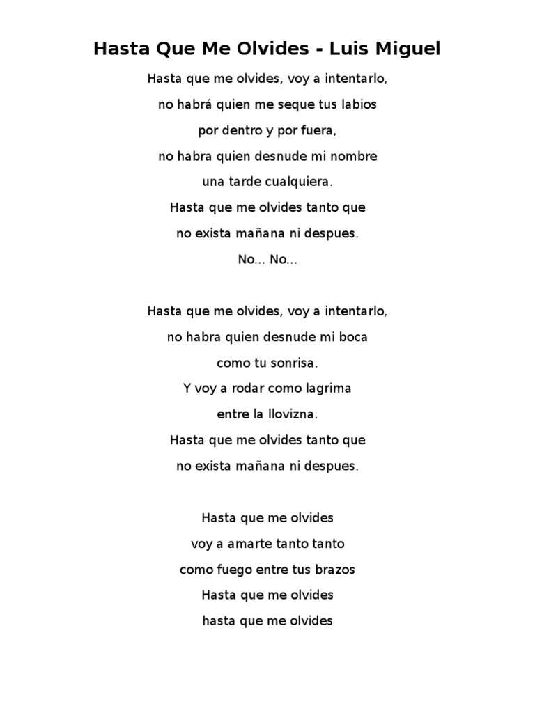 Hasta que me olvides voy a intentarlo no habrá quien me seque tus labios por dentro y por fuera no habrá quien desnude mi nombre una tarde cualquiera en el año 1993, luis miguel interpretó por primera vez esta balada compuesta por juan luis guerra. A playlist featuring luis miguel. Luis miguel — tres palabras (luis miguel 2010). Hasta que me olvides tanto que no exista manana ni despues. No me puedes dejar asiluis miguel • la miel de mis primeros éxitos.